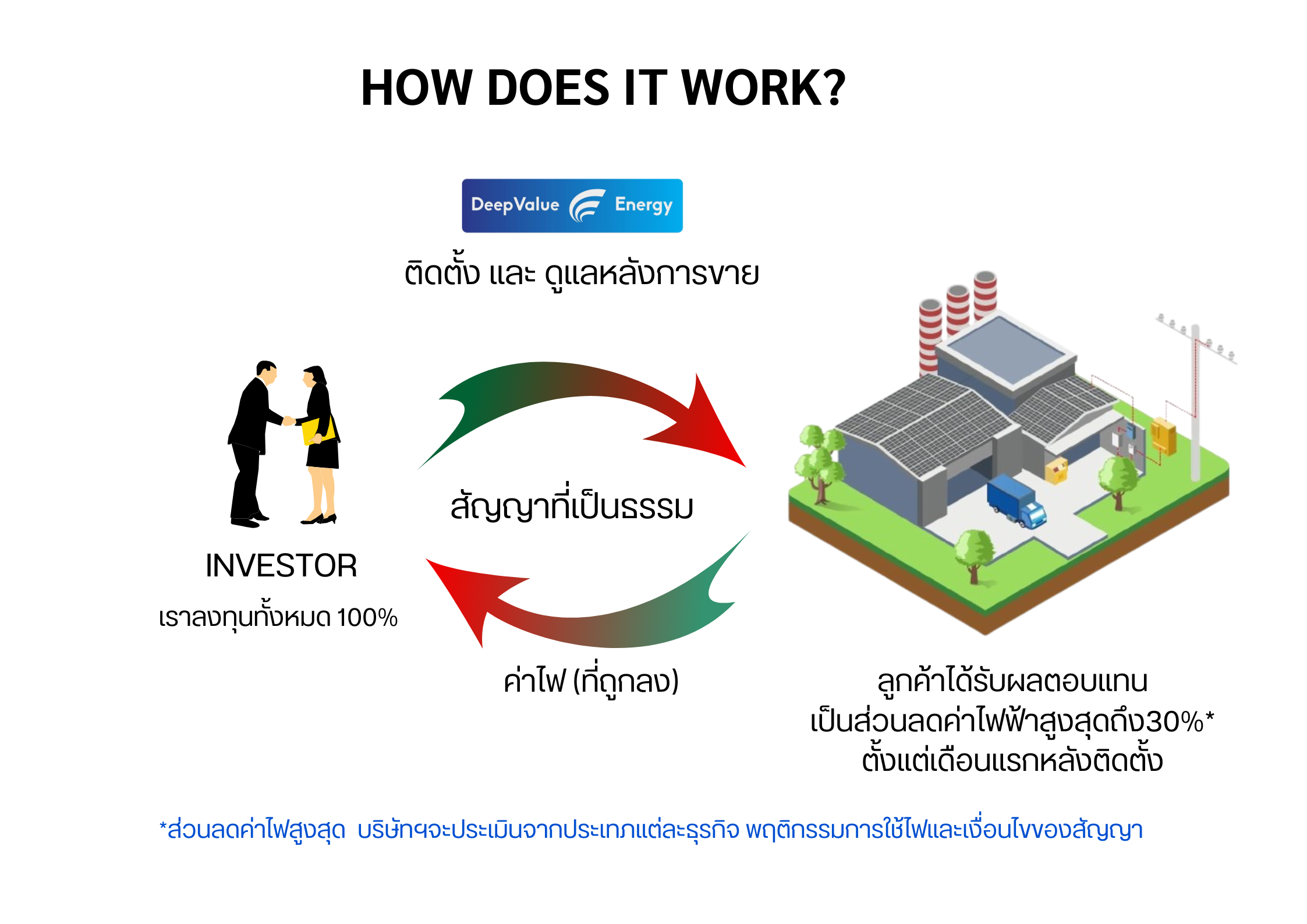 PPA (Power Purchase Agreement) คือสัญญาซื้อขายไฟฟ้าภาคเอกชน โดย DeepValue Energy จะเป็นผู้ลงทุนติดตั้งและบำรุง รักษาระบบโซล่าร์ให้ทั้งหมด ลูกค้าเพียงแค่ทำสัญญาซื้อไฟฟ้าที่ผลิตได้จากระบบโซล่าร์ในราคาที่ถูกกว่าการไฟฟ้า (ส่วนลดสูงสุด 30%) ตลอดอายุสัญญา 15-20 ปี.